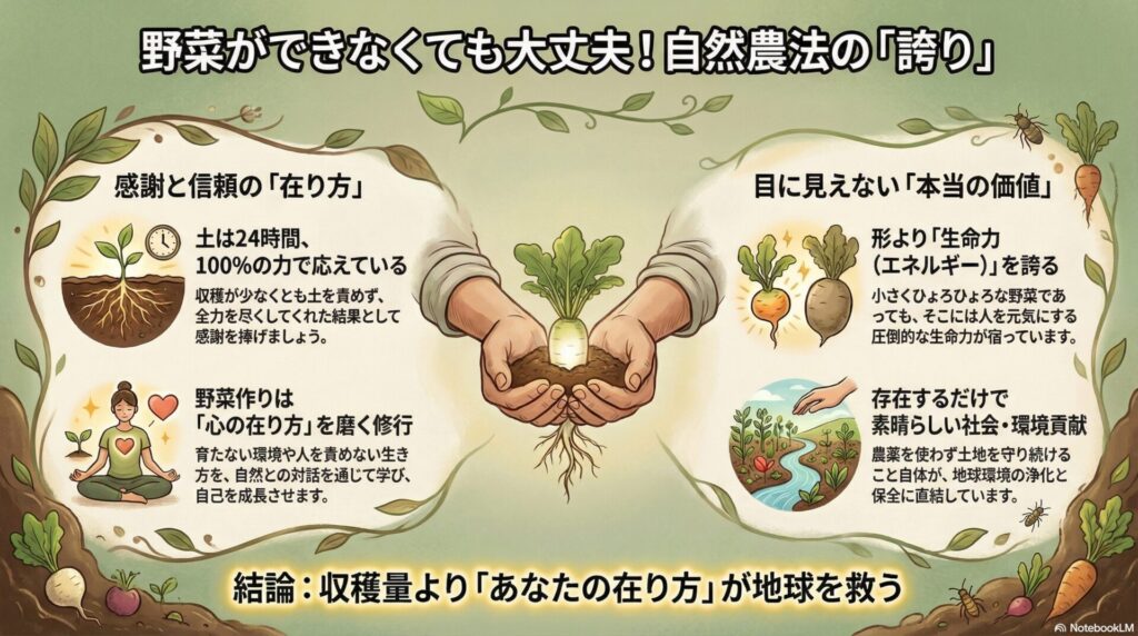 「自然農法を始めた」という志そのものが、すでに大きな成果です。1年1年の積み重ねが地球を救っているという誇りを持って、共に歩んでいきましょう。