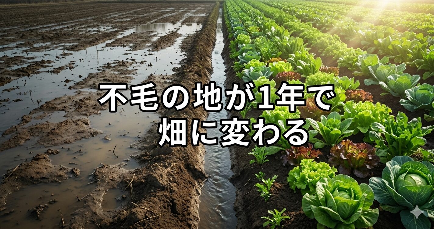 この畑は、借りた当初は雨が降れば洪水のような水浸しになる場所でした。多くの人が諦めてしまうような環境ですが、今橋さんは「溝を掘る」ことで水の通り道を確保しました。