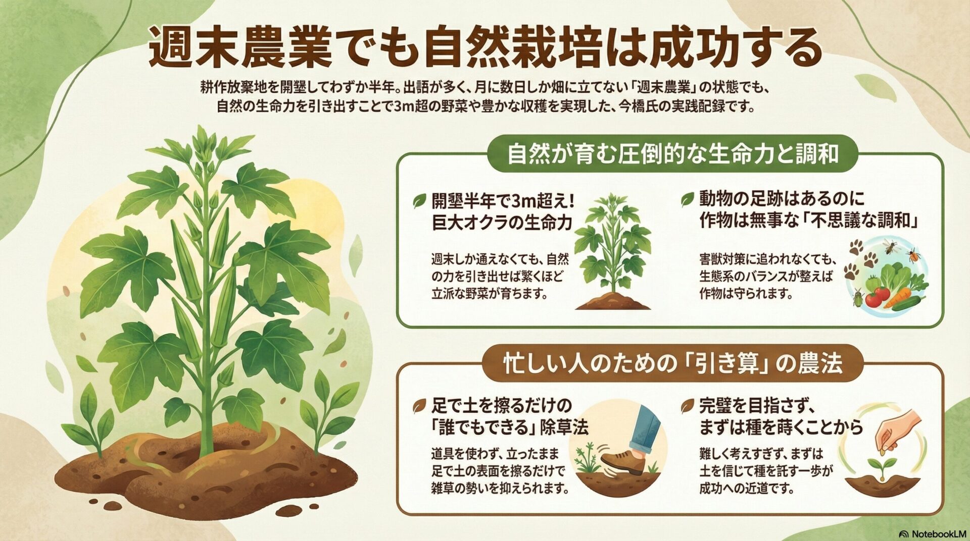 「時間が取れないから」と諦める必要はありません。今橋さんは「とにかく種を蒔いておけば、あとはなんとかなる」と背中を押してくれています。完璧主義にならず、自然の力を信じて一歩踏み出すことが、普及への第一歩と言えるでしょう。