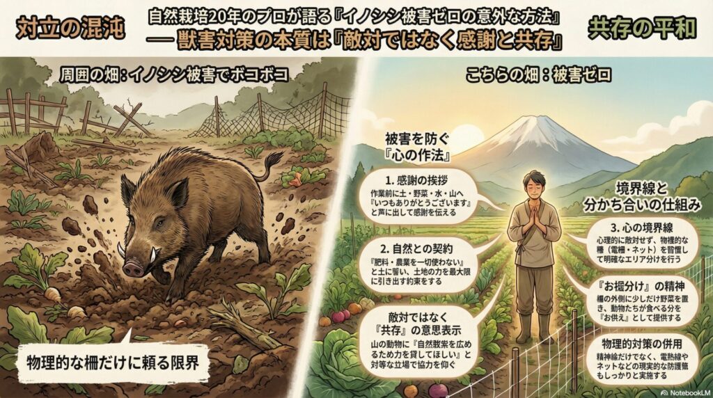 - **動物たちに対して**: 「ここで自然農法を広げ、地球環境を良くしたい。だから荒らさないでほしい。電熱線やネットも張るが、決して敵対するつもりはない」と共生を提案する。